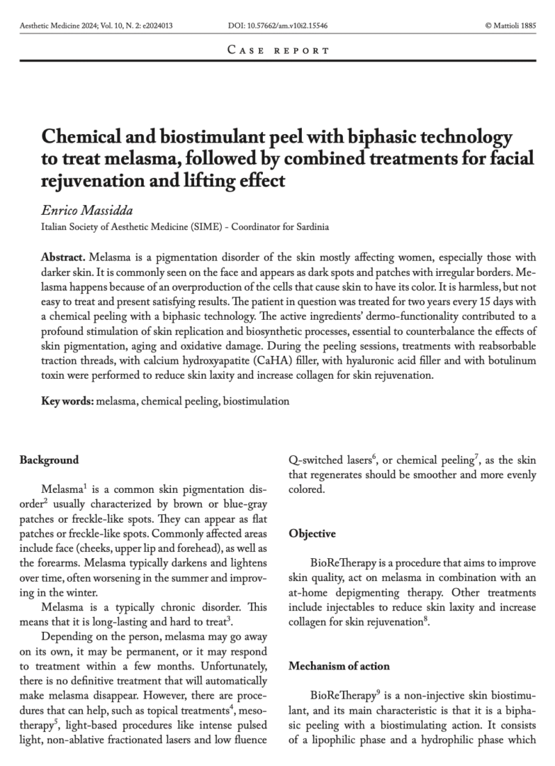 Chemical and biostimulant peel with biphasic technology to treat melasma, followed by combined treatments for facial rejuvenation and lifting effect